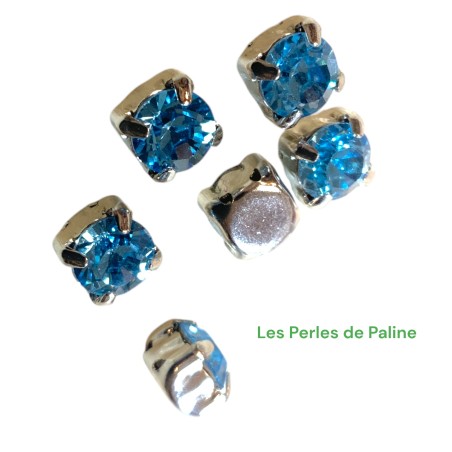 Cabochons "Chatons" référence Swarovski 1028. Forme identique au cabochon 1028. Diamètre : 6 mm, sertis 4 trous (en croix).