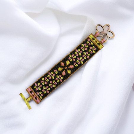 Bracelet Unique Noir Fleurs Rose Vert 22 Cm (x1)