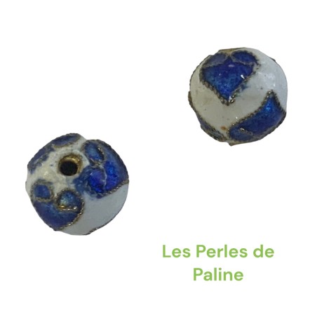 Perle Cloisonnée ronde 9mm Blanc Motif Bleu (x1)